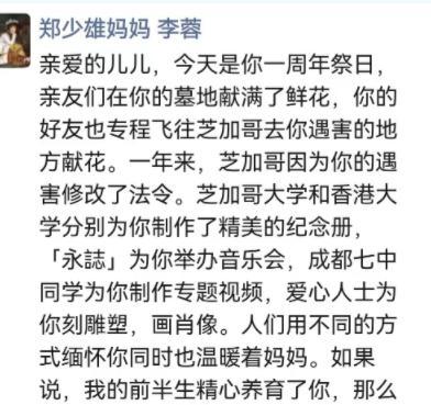 李榮和記者說,自己第1次出國是坐飛機去的,當時不是去旅游和參加兒子的畢業典禮,而是出國參加兒子的葬禮,據這個了解,在2021年11月9日的時候,李榮的兒子鄭少雄當時在芝加哥大學附近的人行道上這樣走著,突然就被槍殺,當時槍殺鄭少雄的人,這是為了搶走其手機和電腦,按這兩種東西當時賣了1000美元,在第2天的時候嫌犯被逮捕。