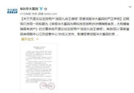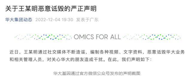 在12月4日的晚上,華大及通過自己的官方微信公眾號(hào)發(fā)布了一則關(guān)于王德明惡意詆毀的嚴(yán)重聲明,在這則聲明中,華大基因稱王德明在自己的社交賬號(hào)上捏造虛假信息,惡意誹謗華大基因,通過虛假信息,煽動(dòng)公眾的情緒,對(duì)于王澤明的詞作為華大基因,將會(huì)追究其法律責(zé)任,對(duì)此消息,時(shí)間財(cái)經(jīng)的記者多次了聯(lián)系雙方,但是一直截止到發(fā)稿,雙方都為做出任何的回應(yīng)。