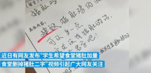 在12月12日,安徽合肥的一所大學內發生了一件讓人啼笑皆非的事情,一名學校的大學生在校方食堂吃過飯以后,在食堂的意見薄中留言稱,希望商家在做飯的時候可以多加幾片豬肚,如果不能多加的話就改名吧,在這名學生留言之后,食堂做出了最直接的回應將所有菜單上的豬肚兩個字都劃掉了。