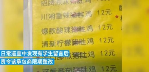 在學校刪除住讀兩次的做法,在網上引發熱議之后,學校方面也做出了回應稱,學校的后勤保障處,曾經在巡查的時候發現了該學生的留言之后,便責令食堂的承包商進行整改,但是乘法算式也在疫情期間買不到豬肚可以旅游,私自將菜單上的豬肚二字刪除掉了,學校方面表示現在已經對學校食堂的承包商作出了處罰,并責令其立即整改,承包商也表示將會按照標準規定整改到位。