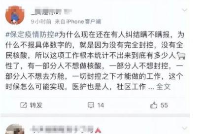 根據(jù)保定市官方公布的數(shù)據(jù)顯示,從12月1日到12月4日,保定市目前新增的陽(yáng)性病例為0,無(wú)癥狀感染者有三例,從官方公布的這各數(shù)據(jù)上能夠看出來(lái)保定市的疫情形勢(shì),已經(jīng)往好的方向發(fā)展。但是卻有大量的保定市市民在自己的微博上發(fā)表成周圍有很多親朋好友都出現(xiàn)了疑似陽(yáng)性的病例,還有一些網(wǎng)友在自己的微博賬號(hào)發(fā)表的文章中稱,就是因?yàn)闆](méi)有完全封控,也沒(méi)有做全員核酸,所以才沒(méi)有具體的感染數(shù)據(jù)。