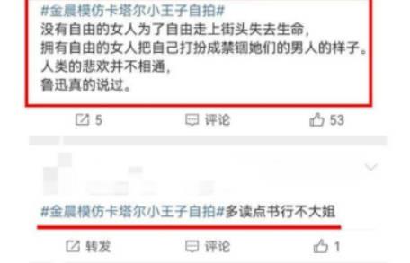 有網友在評論區說曾經魯迅先生說過“沒有自由的女人,為了自由走在街上失去生命,擁有自由的女人,把自己打扮成堅固他們男人的樣子”,或許金晨發動態并沒有想的太多,可能只是玩梗,但是卻將自己的無知暴露了出來,雖然金晨在第一時間將此動態刪除,但是卻仍舊避免不了社交賬號的評論區罵聲不斷。