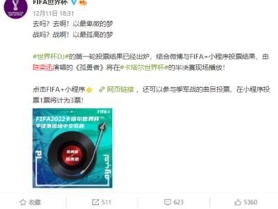 根據(jù)媒體12月10日發(fā)布的最新消息, FIFA2022卡塔爾世界杯地推活動(dòng)的第1輪投票結(jié)果已經(jīng)出爐,在半決賽的時(shí)候?qū)?huì)播放兩首中國歌曲,分別為陳奕迅的《孤勇者》和蘇打綠演唱的《相信》,這兩首歌曲會(huì)在世界杯舉行到半決賽的時(shí)候,在現(xiàn)場分別播放,《孤勇者》在很早之前就開始霸占了各大音樂榜單的熱搜榜,是英雄聯(lián)盟動(dòng)畫劇集中《英雄聯(lián)盟雙城之戰(zhàn)》的主題曲。