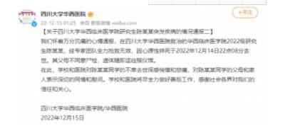 在12月14日的時候,四川大學華西臨床醫(yī)學院,通過微博發(fā)布了關(guān)于四川大學華西臨床醫(yī)學院研究生陳某某突發(fā)疾病的情況通報,在通告中顯示,該校的醫(yī)學研究生陳某某在12月13日的晚上在寢室內(nèi)突發(fā)疾病,學校在第一時間成立了專家救治小組,當時證明學生陳某某出現(xiàn)了呼吸心跳驟停,當時被診定為心源性疾病引發(fā)的呼吸心跳驟停,當時的情況非常危急,醫(yī)院也組織專家團盡最大努力去挽救該學生的生命。
