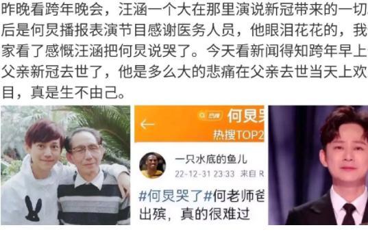 也有一部分網友說,當時何炅是被節目的內容感動了,當汪涵說到醫護人員的時候有了共情,所以才情緒不穩定的哭了,由于何炅一直給人都是非常沉穩的形象,所以這次何炅在節目上哭了的這件事還讓有一部分人覺得有一種表演的成分,但是在1月1日的時候,一則關于“著名主持人何炅的父親新冠去世”的消息登上了熱搜,這個消息一經曝光就在很短的時間內引發了眾網友的熱議。