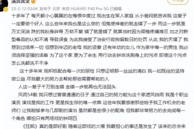 演員韓笑在2月12日凌晨3點多的時候通過自己的微博賬號,發(fā)布了一則道歉聲明,在發(fā)布的聲明中向狂飆劇組表達(dá)了深深的歉意,同時也像所有喜歡這部劇的朋友們道歉,和向所有在一線奮戰(zhàn)的緝毒民警道歉,在文章中表達(dá)了自己深深的歉意和后悔,表示狂飆這部劇真的是非常好,他表示跟著這部劇的越來越火爆,自己最擔(dān)心的事情還是發(fā)生了,之后會選擇面對。