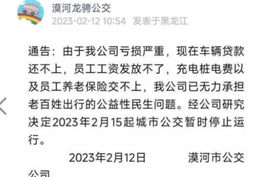 在漠河公交公司發布的通報中稱,由于虧損嚴重,導致公司的車輛貸款還不上,就連員工的工資也發不下來,除了這些,該公司就連充電樁的電費和員工的養老保險金也交不上了,實在是經營不下去了,并表示經過公司的研究,一致決定將會在2月15日停運。