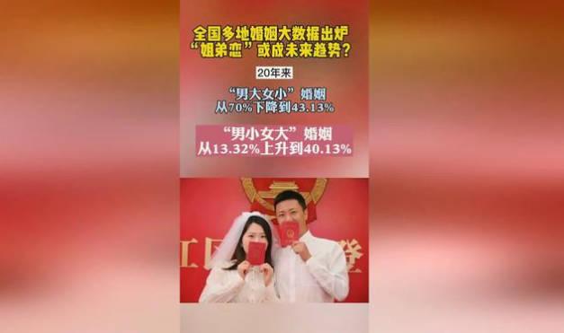 江蘇2022年婚姻大數(shù)據(jù):婚姻登記量連續(xù)5年下降,姐弟戀超兩成 根據(jù)今日江蘇常州,揚(yáng)州,浙江杭州等地民政局所公布的2022年度婚姻大數(shù)據(jù)顯示婚姻登記量已經(jīng)連續(xù)5年下降,江蘇四地平均結(jié)婚登記的年齡均超過30歲,姐弟戀的比例持續(xù)上升。進(jìn)行婚姻登記的女性年齡比男性年齡大1~4周歲的占22.66%,占比第二,這一數(shù)據(jù)基本以2021年持平。男大女小的組合仍然是當(dāng)前辦理結(jié)婚登記的主流,根據(jù)所公布的2022年全省辦理結(jié)婚登記,男女年齡差可以看出男性的年齡比女性大1~4周歲的占比例最多,達(dá)到43.03%。