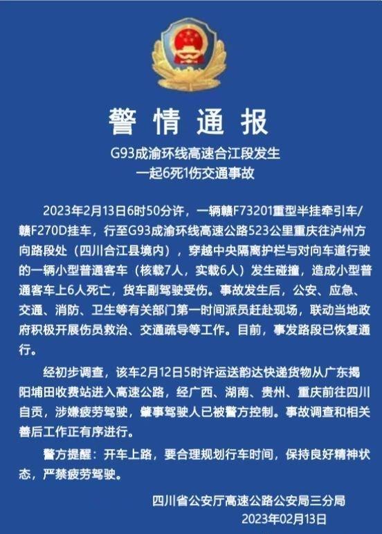 四川省高速公路交警三支隊(duì)發(fā)布警情通報(bào),成渝環(huán)線(xiàn)高速路一輛韻達(dá)快遞貨車(chē),于2023年2月13日早上6:50,與一輛小型普通客車(chē)相撞,導(dǎo)致車(chē)上6人死亡,一人受傷。經(jīng)過(guò)初步的調(diào)查,這輛貨車(chē)是韻達(dá)快遞公司的貨車(chē),于2月12日5:00從廣州揭陽(yáng)莆田收費(fèi)站進(jìn)入高速公路,經(jīng)過(guò)廣西,湖南,貴州,重慶,將前往四川自貢,此次交通事故可能是由于貨車(chē)司機(jī)疲勞駕駛,目前肇事司機(jī)已被警方控制。