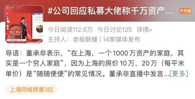近日一名私募大佬的一句發言竟然引發了熱議,知名私募基金經理,??べY產管理合伙人、首席研究官董承非在一場交流路演中說道:“在上海一個1000萬資產的家庭其實是一個窮人家庭,因為在上海房價10萬、20萬是很常見的情況。”對此睿郡資產方面做出回應稱,自媒體斷章取義,放大解讀,對此網友們更是討論激烈。