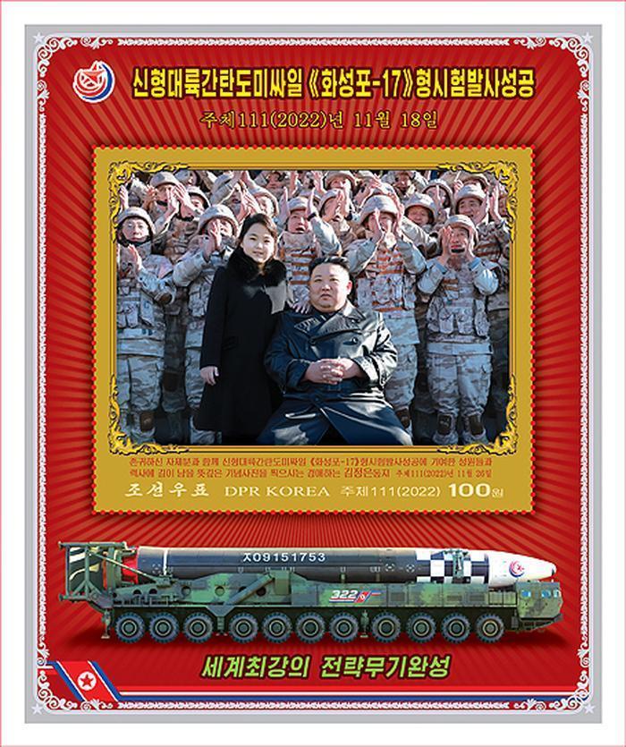 新發(fā)行的郵票一共公布了8種不同的圖稿,圖片內(nèi)容主要是金正恩現(xiàn)場(chǎng)指導(dǎo)“火星-17”型新型洲際導(dǎo)彈時(shí)拍的照片,金正恩和女兒亮相的郵票中均以導(dǎo)彈為背景,父女倆牽手并排走,還有和人民軍并的合影。郵票正中間就是金正恩父女倆的照片,在郵票的下方印有裝在發(fā)射車上的導(dǎo)彈,每一張郵票上的宣傳語也不同,包括“無上光榮屬于金正恩同志”、“向全世界展示不敗的核強(qiáng)國(guó)威容”、“向全世界展示朝鮮的戰(zhàn)略力量、絕對(duì)力量”等三種。