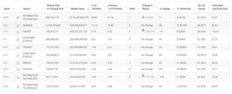 2022年第四季度末的數據顯示,伯克希爾目前持倉的股票為蘋果、雪佛龍,美國銀行,美國運通、可口可樂,卡夫亨氏,穆迪,動視暴雪,惠普,西方石油。