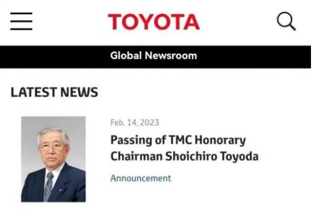 2月14日豐田汽車發布了相關聲明,公司名譽會長的豐田章一郎于14日逝世,享年97歲。