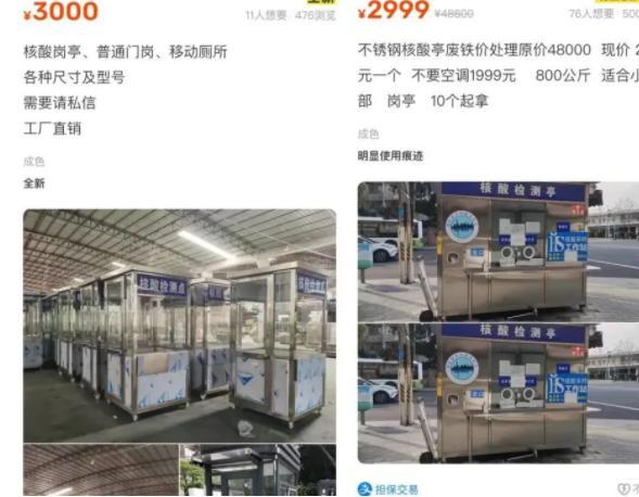 從疫情開始這三年,疫情防控相關的生意成為暴利產業,新的聲音引來無數的商人紛紛加入,從核酸檢測到核酸停生產,一度帶來了極大的暴利,自從在2022年年底,國內多個地區開始陸續解除有關疫情的防控管控,至此以后暴利產業變成陷阱,不僅大量核酸檢測人員面臨失業,工廠里的核酸亭也面臨滯銷,總有人能在“一地雞毛”中尋覓商機,有人將這些核酸亭掛在閑魚交易平臺上銷售。