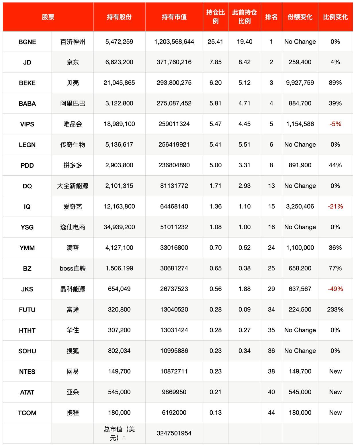 高瓴買入的股票排在前五的分別是自由港麥克蘭莫蘭,拼多多,阿里巴巴,貝殼找房,在粗略計算之下,2022年第四季度末在高齡基金排在前,50的中概股總合計的市值達到了32.47億美元,占據高齡基金在持倉量的68.5%。