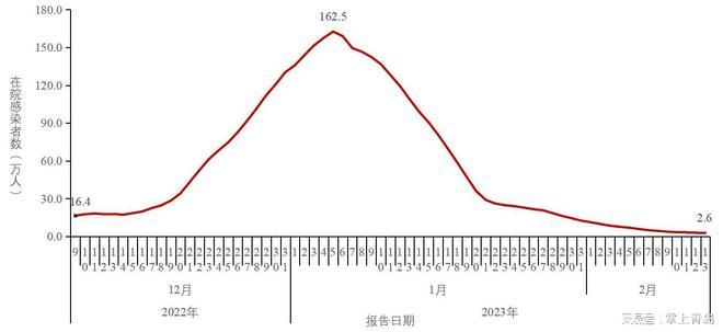 2023年2月15日中國疾控中心發布全國新冠病毒感染的最新情況,從2月13日在院治療的新冠病毒感染死亡率下降至9例,較峰值下降99.8%。最新的數據在2023年1月5日時全國感染新冠病毒的數量高達162萬人左右,之后持續下降,2月13日下降到2.6萬人,減少將近98.4%。重癥患者從2022年12月27日至2023年1月3日期間將近每天增加1萬,直到1月4日之后,每天呈現下降趨勢,1月5日達到巔峰12.8萬左右,2月13日僅有103例,下降99.9%。感染新冠病毒死亡病例最高的峰值是在1月4日每日大概有4273例,2月13日只剩下九例,峰值下降99.8%。