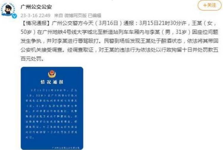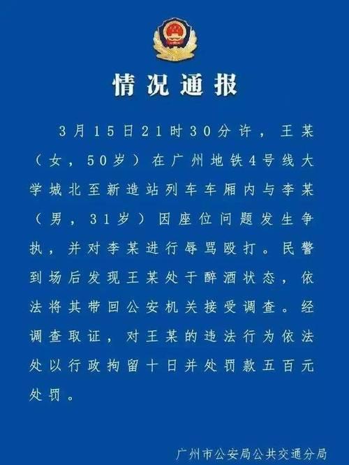 3月16日廣州公交警方發布了一則通:女子王某于3月15日晚上21:30左右,在廣州地鐵的4號線,大學城北至新造站的一節列車車廂里,對一名男子進行毆打辱罵。對王某實施拘留10日和500元的罰款的處罰。