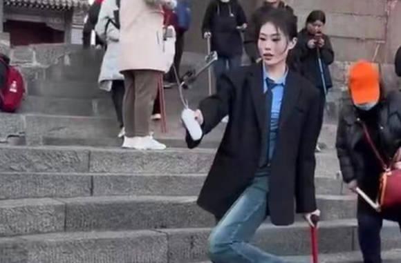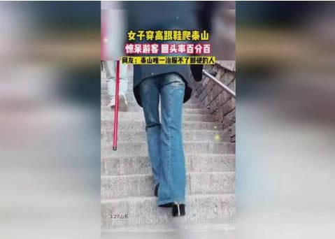 從發布的視頻中可以看出,該女子穿著一雙足足有10公分的黑色高跟鞋,住著一根白色的拐杖,沿著泰山的時間一步一步向上攀登。在視頻中,該女子聲稱:”泰山會制服每一個嘴硬的人,但制服不了腳硬的人。“