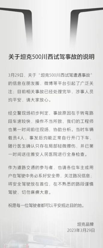 3月29日,“坦克500川西事件遭遇事故”迅速登上熱搜。幸運的是當時的車上坐乘人員并沒有出現(xiàn)嚴重的傷情,針對此次事故,在網上也引發(fā)了激烈的討論。最新消息,坦克官方給出的回應是:經交警現(xiàn)場初步判定事故原因在于轉彎路段車速較快,操作不當所致,坦克工程師也第一時間前往現(xiàn)場協(xié)助分析。