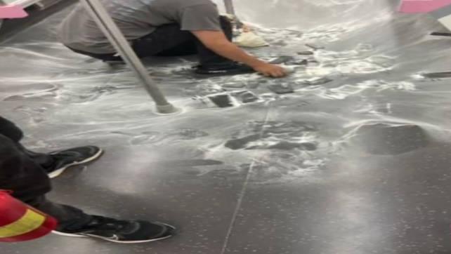 有的乘客當時看到白煙的時候心里非常害怕,甚至在想如果這些電池爆炸了會怎么辦,所有的人都朝著一個方向奔跑。他看著那個冒煙的背包和大家一起進行躲避。現場有多個疑似手機電池的物品散落在地,地上還留著滅火器,干冰旁邊有人拿著滅火器在進行滅火。