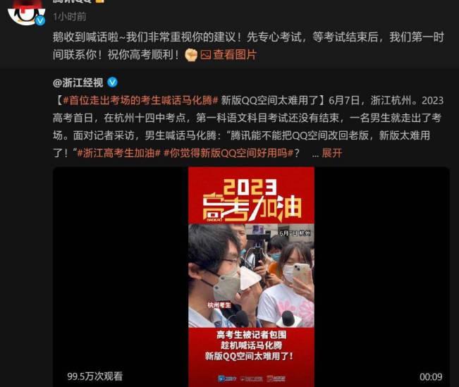 科技早報最新消息,騰訊已經就高考考生喊話馬化騰的消息作出了最新的回應。高考第1場考試于6月7日正式開始??荚嚱Y束之后,高考考生走出考場喊話馬化騰,希望騰訊能夠將QQ空間改回為舊版,新的QQ空間太難使用。騰訊第一時間看到了這條消息并且進行了回應。鵝收到喊話啦,我們非常重視你的建議,先專心考試,等考試結束后,我們第一時間聯系你,祝你高考順利。